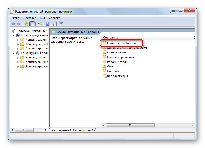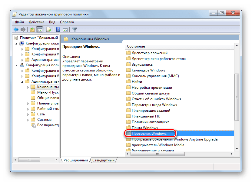 - Перейдите к разделу «Конфигурация пользователя» — «Административные шаблоны» — «Компоненты Windows» — «Проводник»