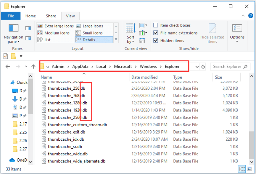 When you open a folder that contains images, video, or other media files, you will get small previews of these files called thumbnails. To help media files load instantly, your Windows will save these thumbnails in *.db files as hidden temporary files. By default, the thumbnail cache is stored in the path C:UsersAdminAppDataLocalMicrosoftWindowsExplorer.