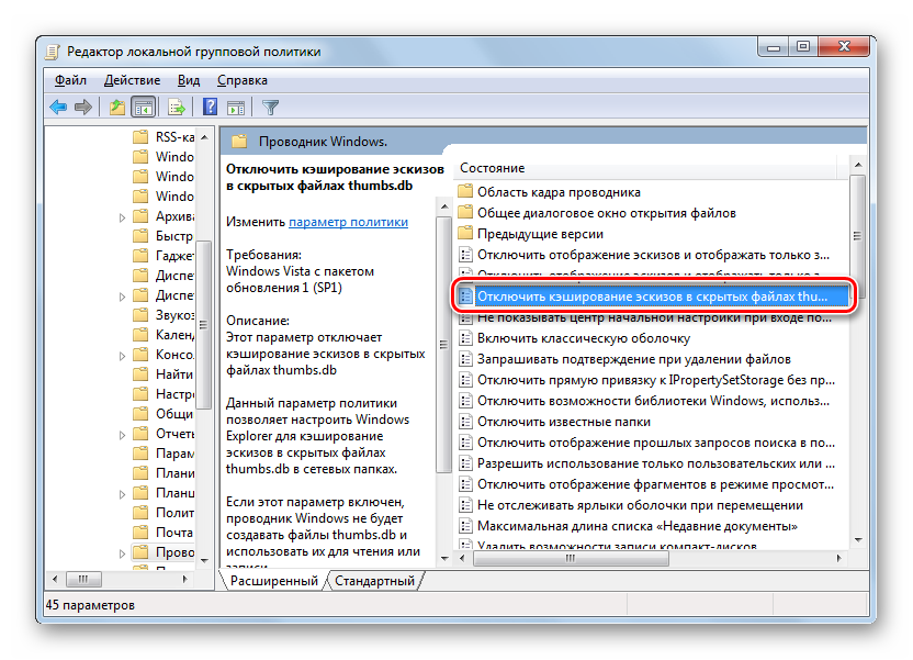 Два раза кликните левой кнопкой мышки по наименованию «Отключить кэширование эскизов в скрытых файлах thumbs.db»