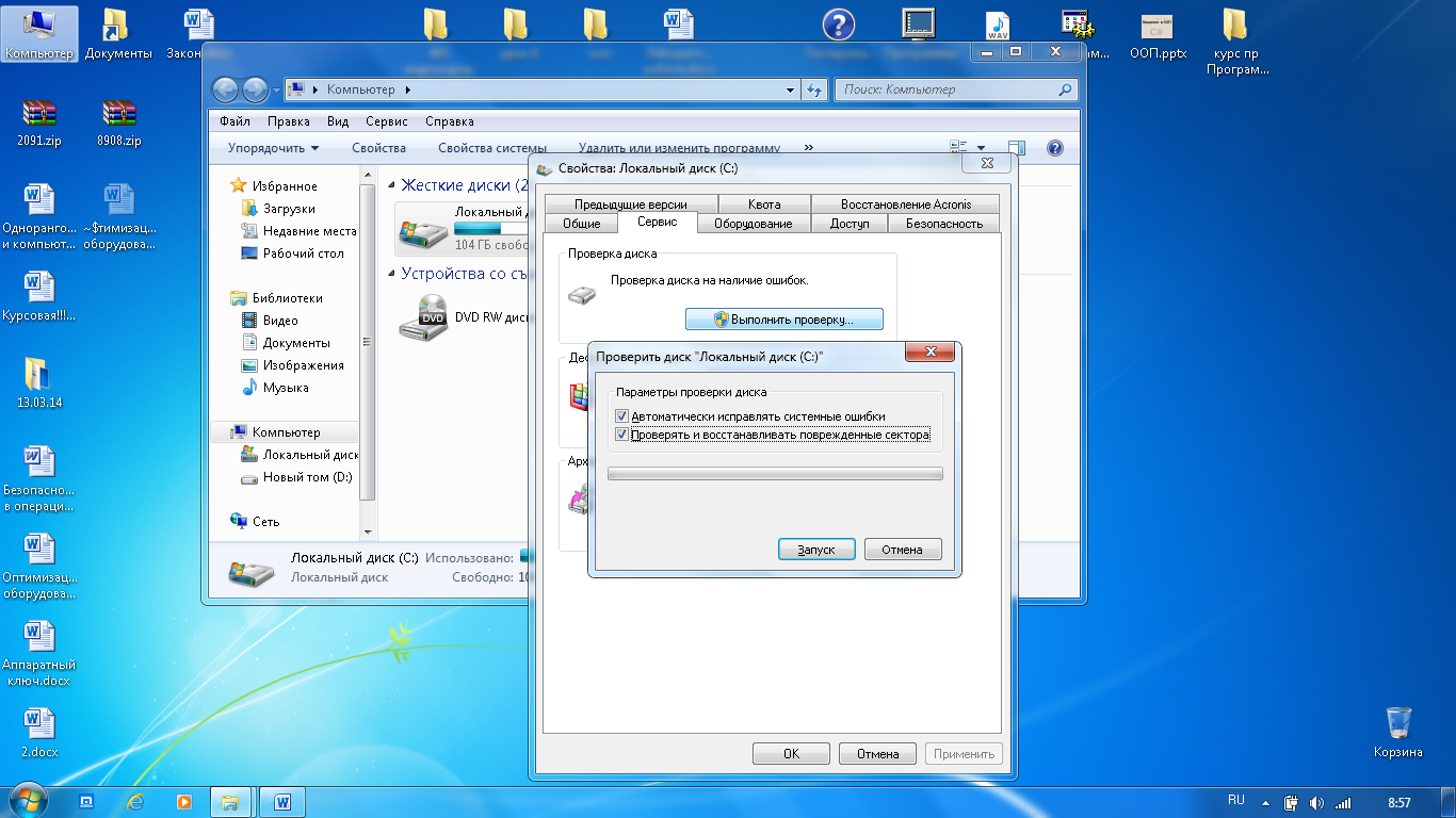 Обслуживание жёсткого диска состоит из проверки кластеров, выполнение дефрагментации, осуществление сжатия тома, и другие операции. Выполнить проверку жёсткого диска на присутствие ошибок и нечитаемых секторов возможно следующим образом. Чтобы проверить диск или любой другой информационный носитель, нужно открыть свойства этого носителя (жёсткого диска, Flash накопителя), найти пункт «сервис» и запустить проверку, поставив предварительно галочки в меню «Автоматически исправлять системные ошибки» и «проверять и восстанавливать повреждённые сектора.
