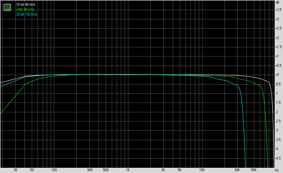 Также мы сравнили работу карты в разных режимах: 16 бит 48 кГц, 24 бит 96 кГц и 32 бит 192 кГц.