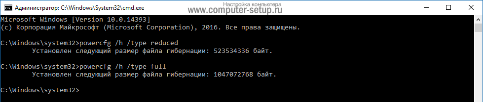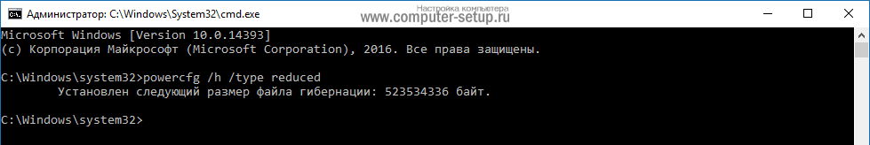 - Теперь введите команду . Нажмите Enter. После этого вы получите уменьшенный размер файла гибернации, необходимый и достаточный для работы быстрого запуска, и не более.