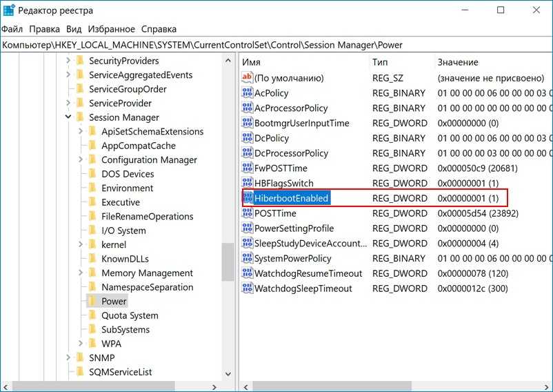 • в папке Power следует найти файл под названием HiberbootEnabled;