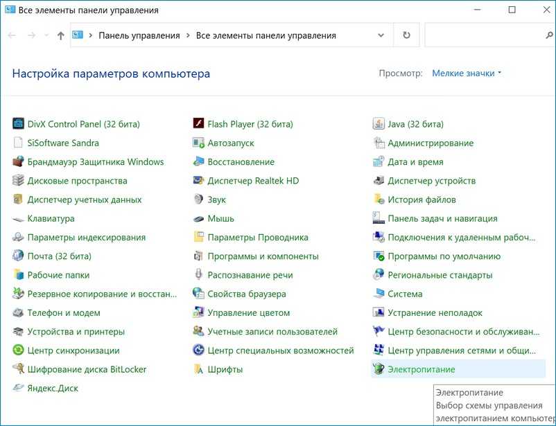 Выберите раздел «Электропитание». Для быстрого перехода вы можете включить в меню «Панель управления» режим Просмотра: Крупные значки (Мелкие значки).