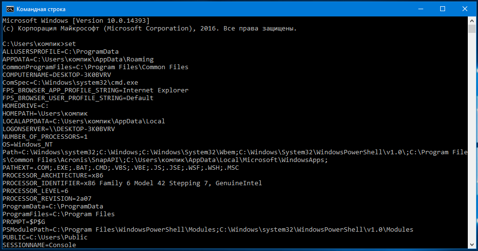 И Windows тут же выведет полный список всех переменных окружения вместе с их значениями.