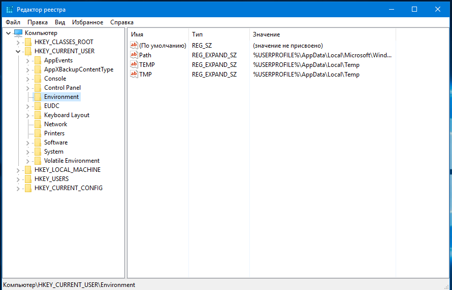 | TEMP или TMP | Указывает путь к временным каталогам, принятым по умолчанию. Эти каталоги используются приложениями, доступными зарегистрированному в системе пользователю. Некоторым приложениям требуется значение переменной TEMP, в то время как другим — TMP (системная и пользовательская переменные соответственно) |
