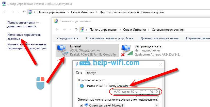 Дальше, слева нажмите на пункт меню Изменение параметров адаптера. Нажмите правой кнопкой мыши на адаптер Ethernet и выберите Свойства. Дальше, просто наведите курсор на название вашей сетевой карты в поле «Подключение через», и в всплывающем окне вы увидите MAC-адрес вашей сетевой карты.