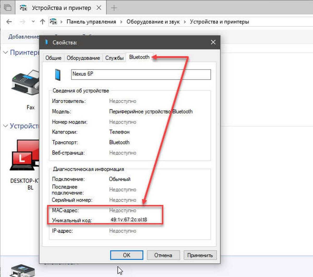 - В окне «Свойства» перейдите на вкладку Bluetooth. Вы увидите поле MAC-адреса и адрес должен быть указан там. Если это не так, посмотрите немного ниже, и вы увидите поле «Уникальный код», который и будет MAC-адресом вашего устройства.