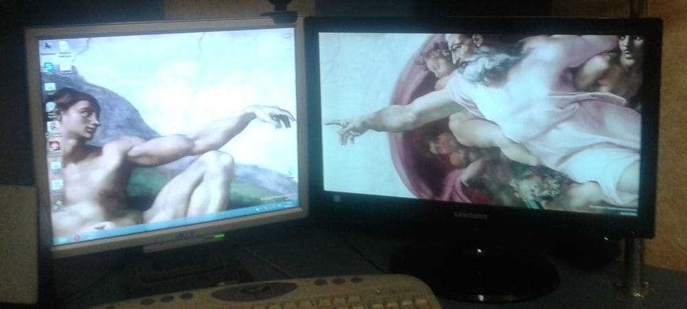 Что-то я немного в шоке от того, что на мой коммент, который написал по приколу, столько ответов. Но все равно спасибо за совет, хотя я и так пользуюсь displayfusion. Получается большая картинка с двумя мониторами, натягиваешь, как тебе нужно желаемые картинки, сохраняешь и устанавливаешь как обои рабочего стола в режиме “Замостить”.