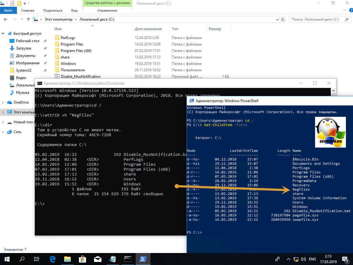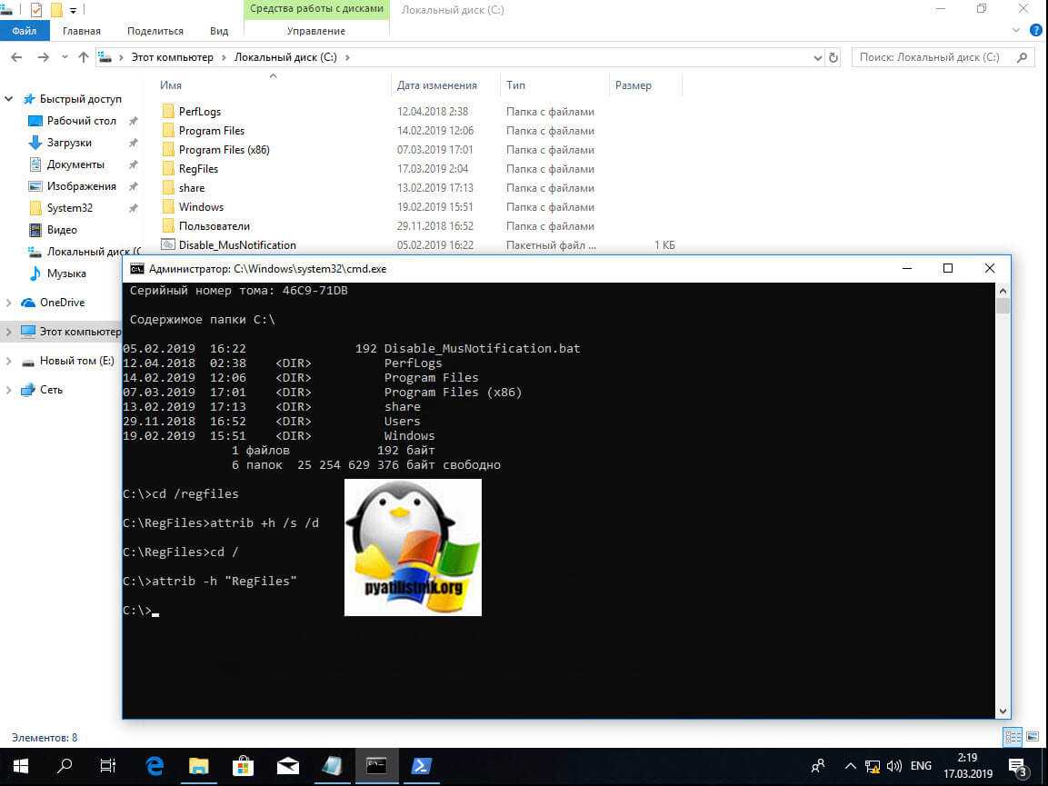 То же самое можно выполнить и из командной строки. Предположим, что я хочу сделать папку C:\RegFiles скрытой. Для этого находясь в командной строке, желательно открытой от имени администратора, перейти в нужный каталог, где содержится нужный объект, напоминаю, что моя папка лежит в корне диска C:\