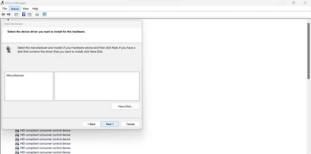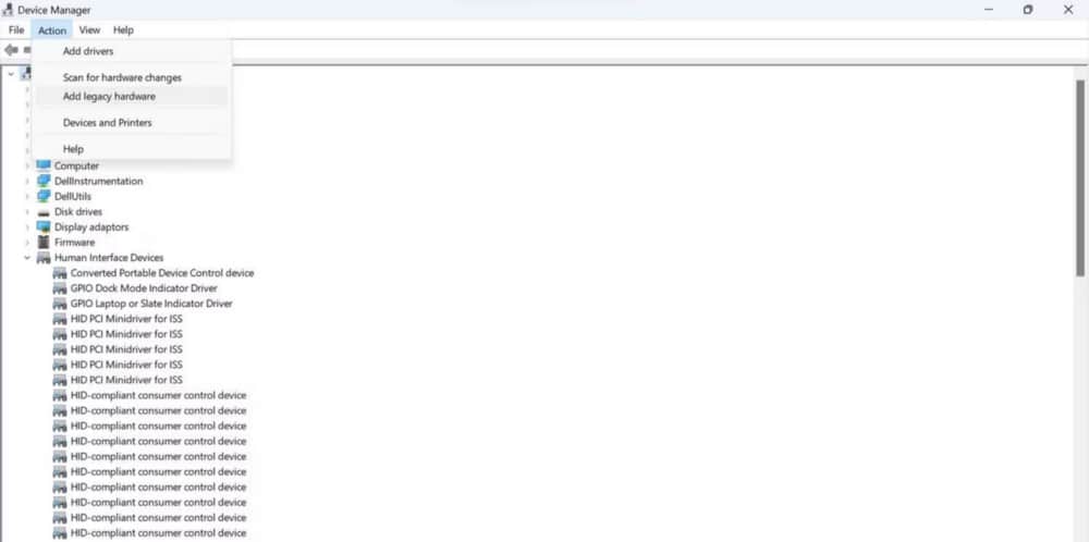 - Перейдите на вкладку «Действие» и нажмите «Добавить устаревшее оборудование».