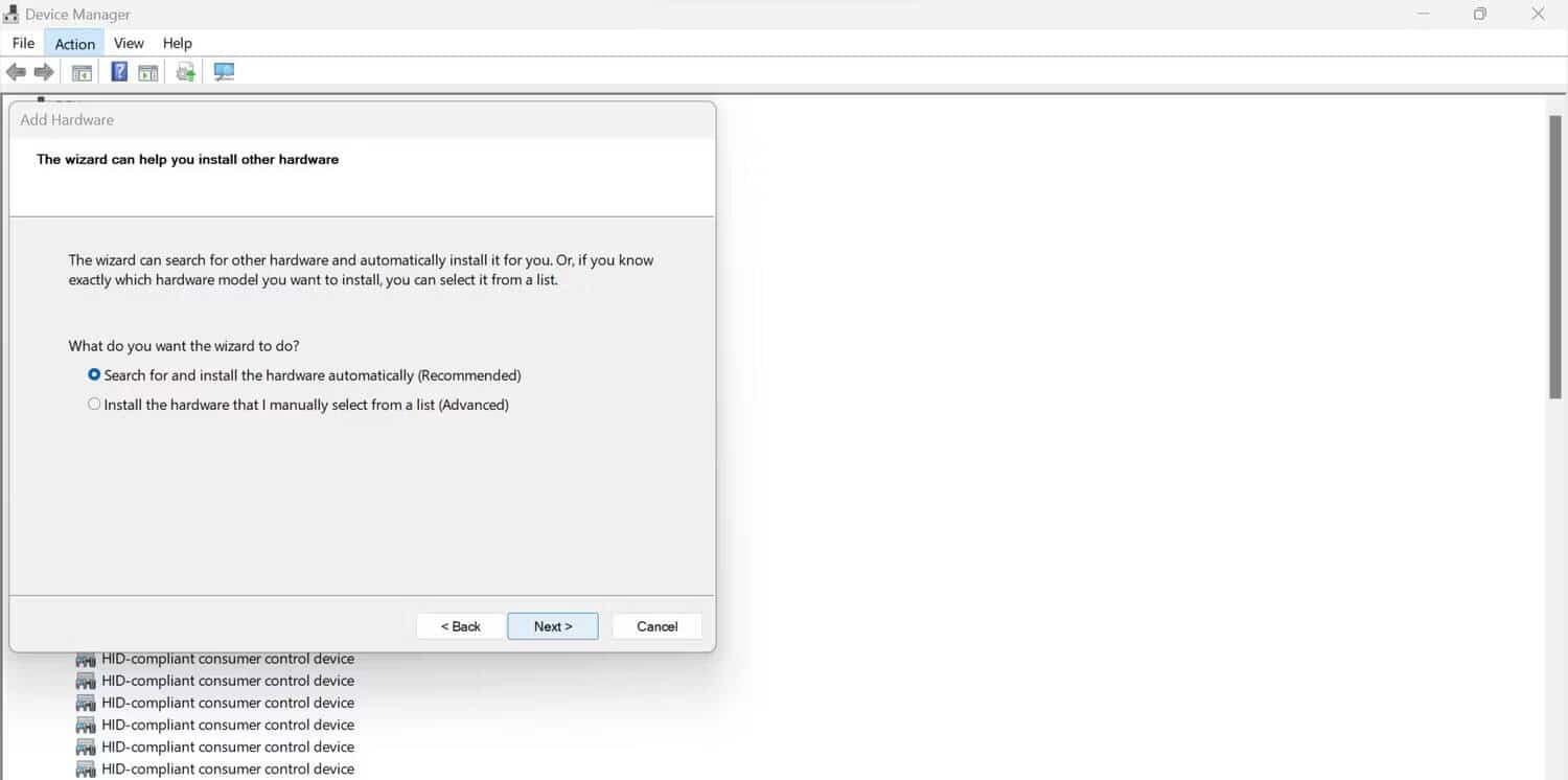 Диспетчер устройств позволяет пользователям вручную добавлять устройства, которые не обнаруживаются системой автоматически. Итак, на следующем шаге добавьте камеру в Диспетчер устройств с помощью мастера добавления устройств. Этот мастер позволяет установить устройство вручную или автоматически. Давайте перейдем к автоматической опции, чтобы все было просто.