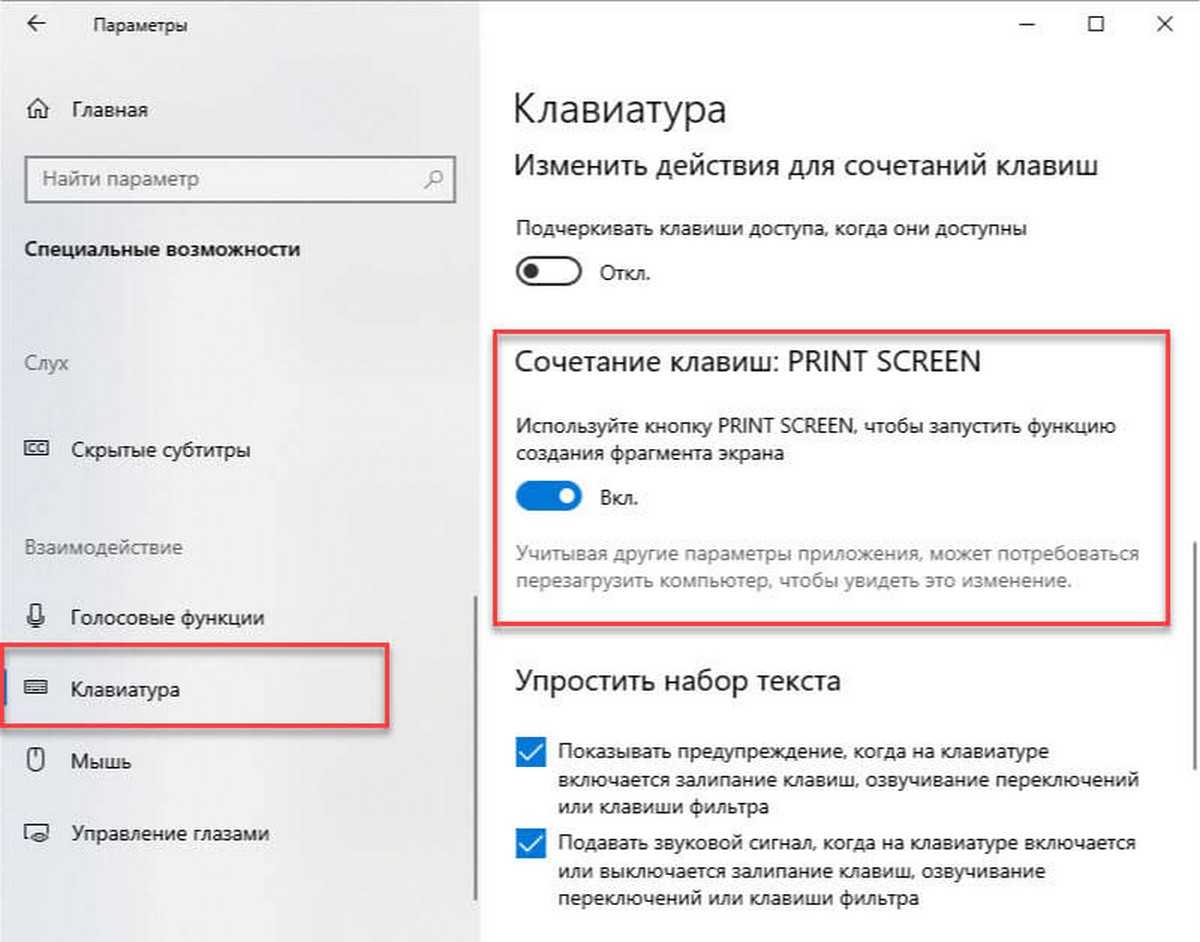 Отключить Snipping Tool или Print Screen в Windows 10