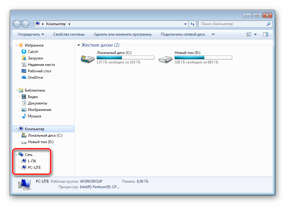 - Через окно «Компьютер» в разделе «Сеть» выберите необходимый ПК, который соединен с вашей локальной группой.