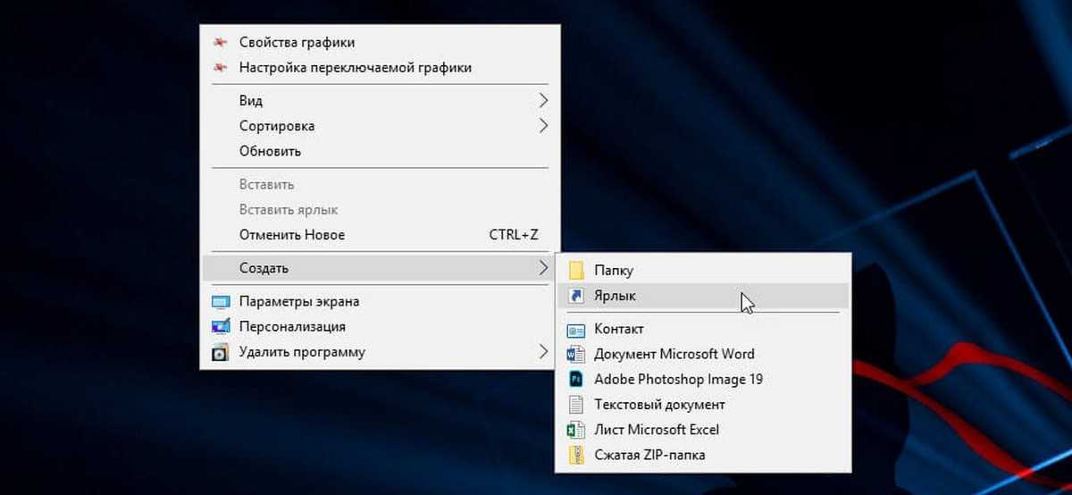 - Щелкните правой кнопкой мыши пустое место на рабочем столе. Выберите «Создать» — «Ярлык» в контекстном меню (см. Снимок экрана).