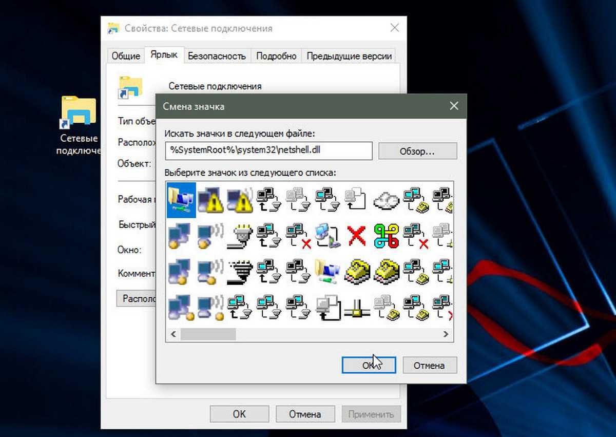 - На вкладке «Ярлык» вы при желании можно указать новый значок. Вы можете использовать значок из файла % SystemRoot% system32 netshell.dll . Нажмите OK, чтобы применить значок, затем нажмите OK, чтобы закрыть диалоговое окно свойств ярлыка.
