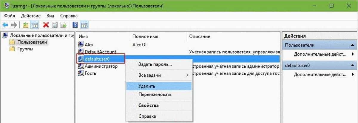 3. Откройте папку Пользователи и правой кнопкой мыши кликните на записи defaultuser0. Выберите Удалить.