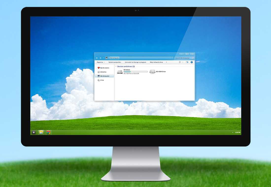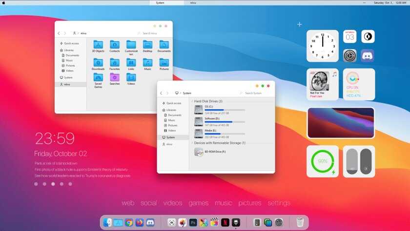 Первой темой будет Big Sur, которая понравится любителям дизайна Apple. Кроме внешнего вида окон и иконок, этот пак включает в себя виджеты для Rainmeter, а также скин для приложений, имитирующих Dock из macOS — Rocketdock или Nexus.