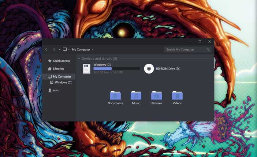 Надоели скучные монохромные темы? На этот случай есть Dracula, которая привносит больше красок в оформление системы. Вместо оттенков серого, преобладают фиолетовые тона и градиенты. Также доступны разные вариации иконок для закрытия или сворачивания окон, скины для StartIsBack и оформление для Microsoft Office.