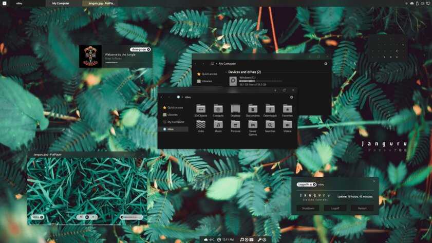 Особенностью этой темы является поддержка размытия заголовков окон, а также полностью чёрный фон приложений. Кроме этого, у Janguru есть свои значки курсора, большой набор иконок и виджетов для Rainmeter.