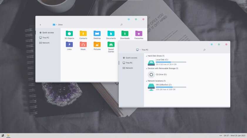 В отличие от других тем, эта не меняет стиль системы кардинально, а лишь немного дополняет его — более минималистичный проводник с обновлёнными иконками поможет освежить пользовательский опыт, добавив в него новые краски.
