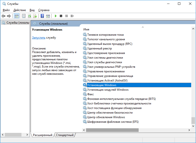 Проверить, запущена ли служба установщика Windows и есть ли она вообще