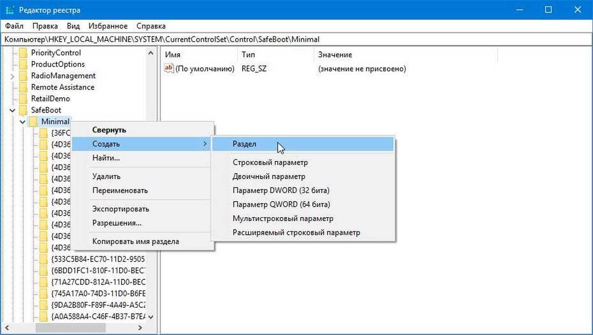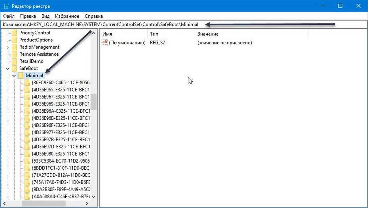 HKEY_LOCAL_MACHINESYSTEMCurrentControlSetControlSafeBootMinimal (если система запущена в обычном Safe Mode) или раздел HKEY_LOCAL_MACHINESYSTEMCurrentControlSetControlSafeBootNetwork (если используется безопасный режим с поддержкой командной строки)