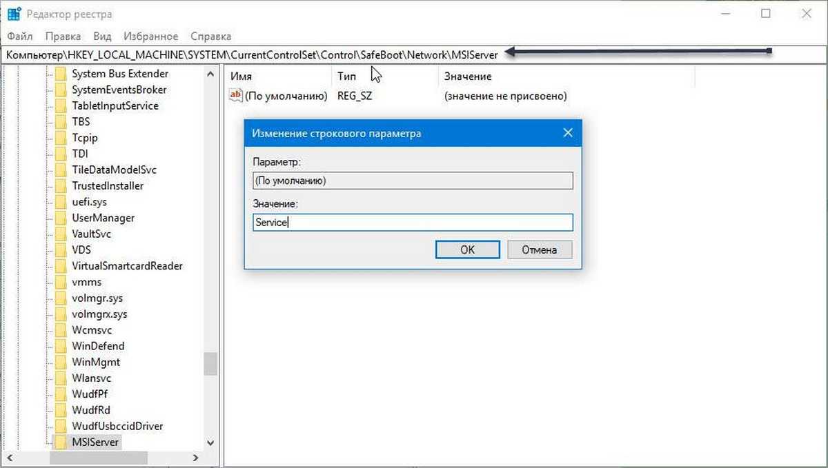 - Click MSIServer key. In the right window, double-click the Default key and set its Value data as Service. This can enable Windows Installer in Safe Mode without network support.