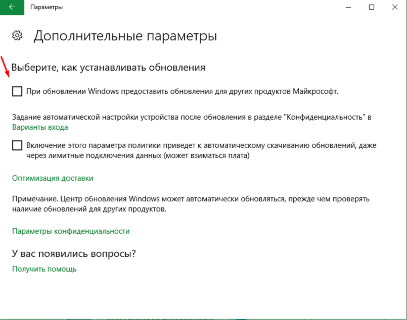 Снимаем галочку с пункта «При обновлении Windows предоставить обновления для других продуктов Майкрософт». Чтобы не получать обновления разных продуктов, например, Office, Xbox, Skype и т.д.