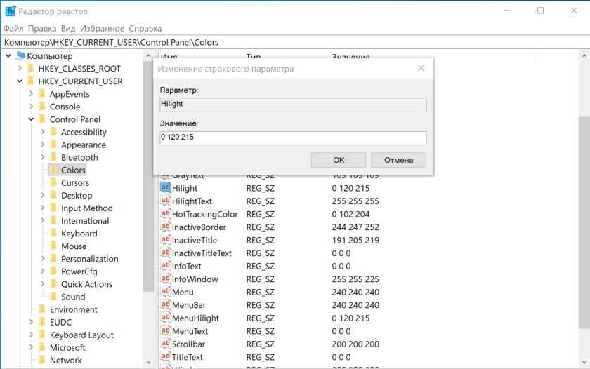 3. Перейдите по пути HKEY_CURRENT_USER\Control Panel\Colors => в разделе Colors откройте параметр Hilight (этот параметр меняет цвет границы прямоугольника) => в поле “Значение” введите значения цвета, которые вы запомнили в Paint => к примеру значение красного у меня 81, значение зеленого 174 и синего 143, мне нужно в поле “Значение ввести” 81 174 143 и нажать на “ОК” (между значениями ставьте пробел).