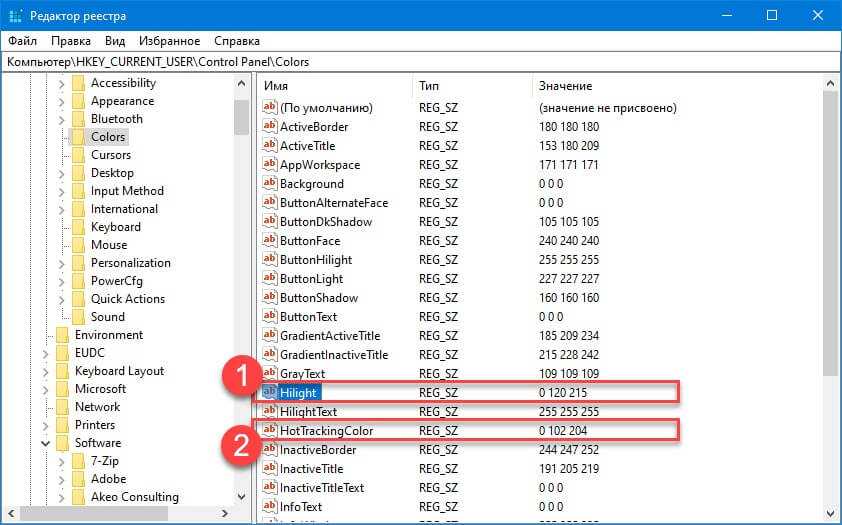 Воспользуйтесь этим простым твиком реестра. Запустите командой regedit редактор реестра и разверните ветку HKEY_CURRENT_USER\Control Panel\Colors . В правой колонке найдите два строковых параметра HotTrackingColor и Hilight.
