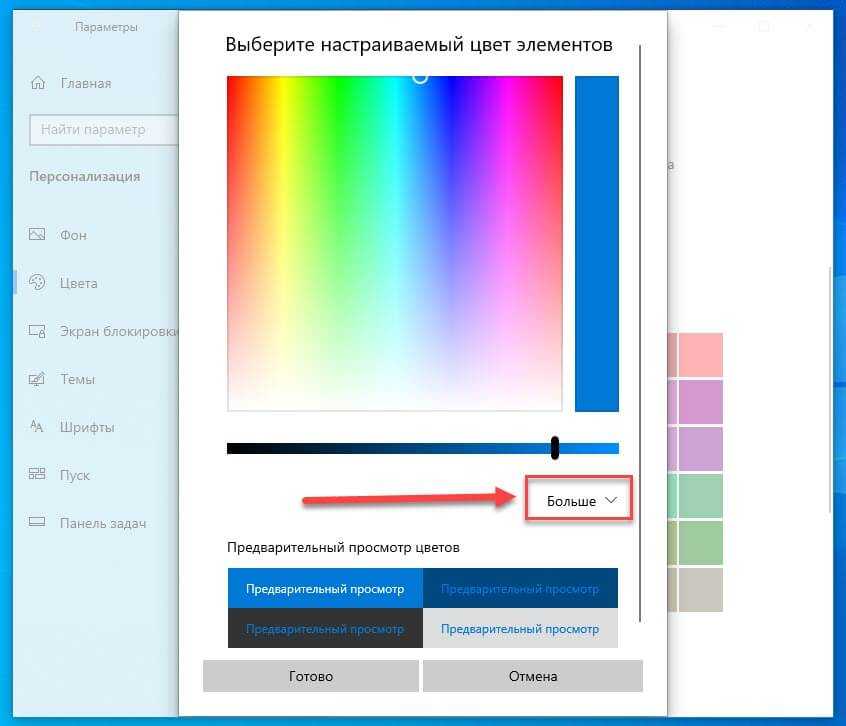 Шаг 5: В разделе «Выбор цвета элементов» нажмите кнопку « + Дополнительный Цвет». В открывшемся окне нажмите кнопку «Больше ^» и выберите нужный вам цвет который вы хотите видеть в области выделения.