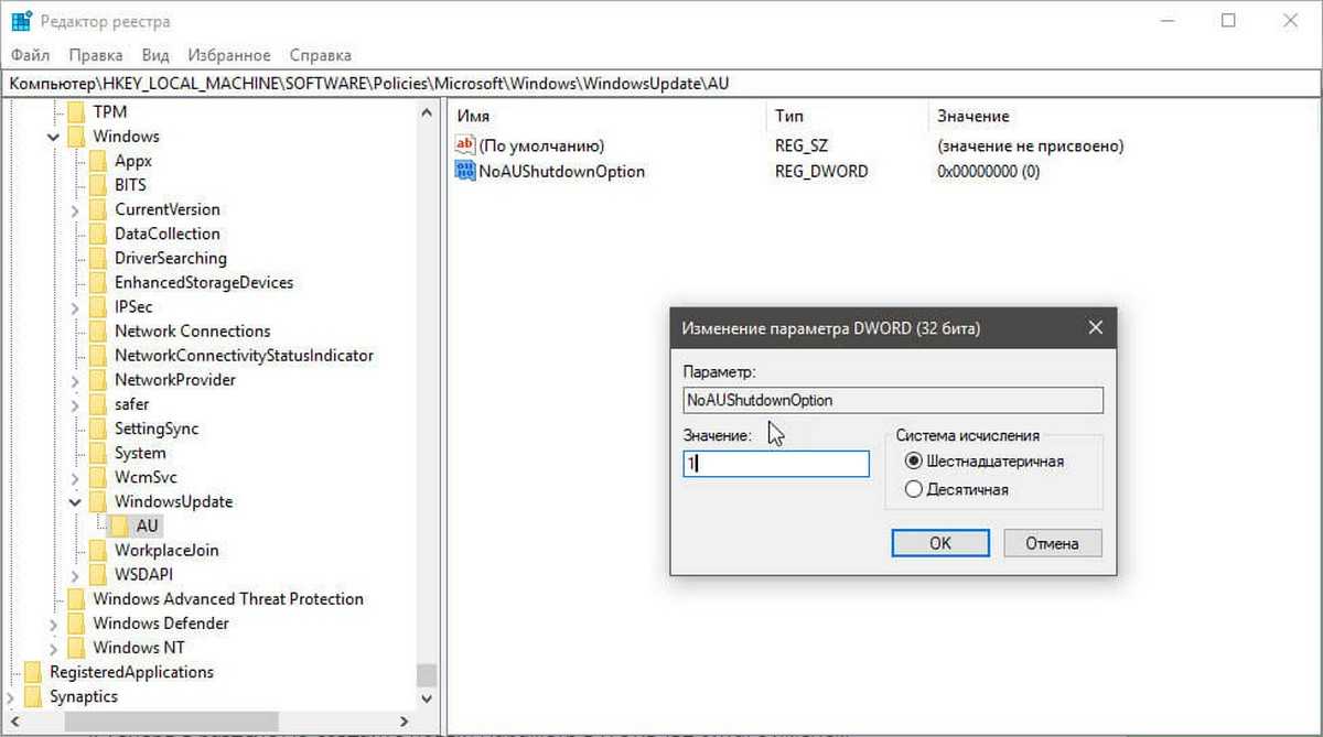 - В подразделе AU создайте три параметра DWORD: NoAUShutdownOption, NoAUAsDefaultShutdownOption и NoAutoRebootWithLoggedOnUsers.