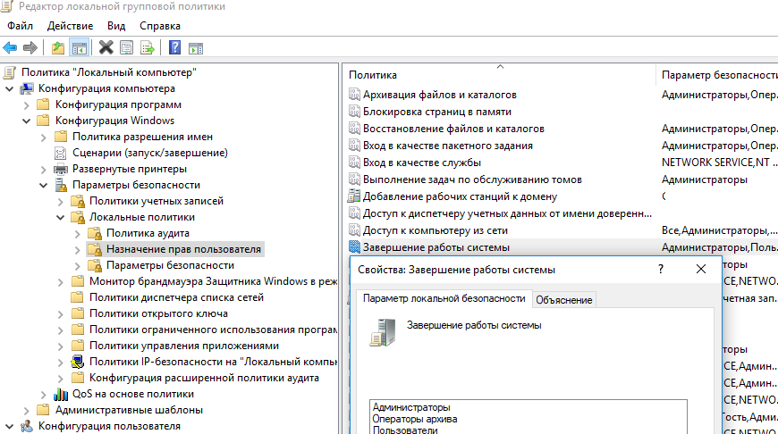 Откройте редактор локальной политики gpedit.msc и перейдите в указанную выше секцию. Как вы видите, в Windows 10 права на перезагрузку (выключение) компьютера есть у членов локальных групп: Администраторы, Пользователи и Операторы архива.