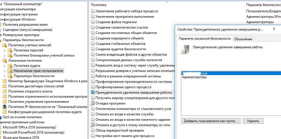 Для этого необходимо добавить учетную запись нужного пользователя в политику “Принудительное удаленное завершение работы” (Force shutdown from a remote system) в той же самой секции GPO Назначение прав пользователя (User Rights Assignment).