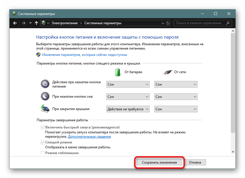 Настройте параметры действия закрытия крышки ноутбука в параметрах электропитания