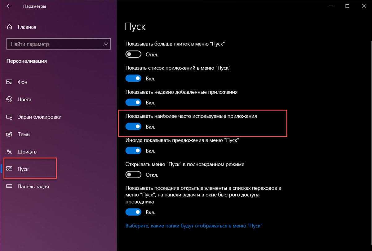 Данный параметр при включении отображает список часто используемых программ и приложений в верхней части меню «Пуск» для быстрого доступа к ним.