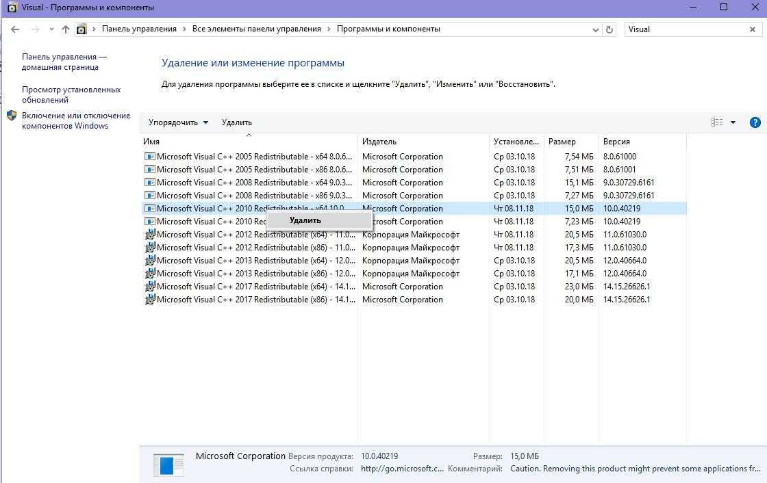 Ищем в списке Microsoft Visual C++ 2010, и, если он имеется, удаляем его