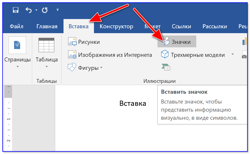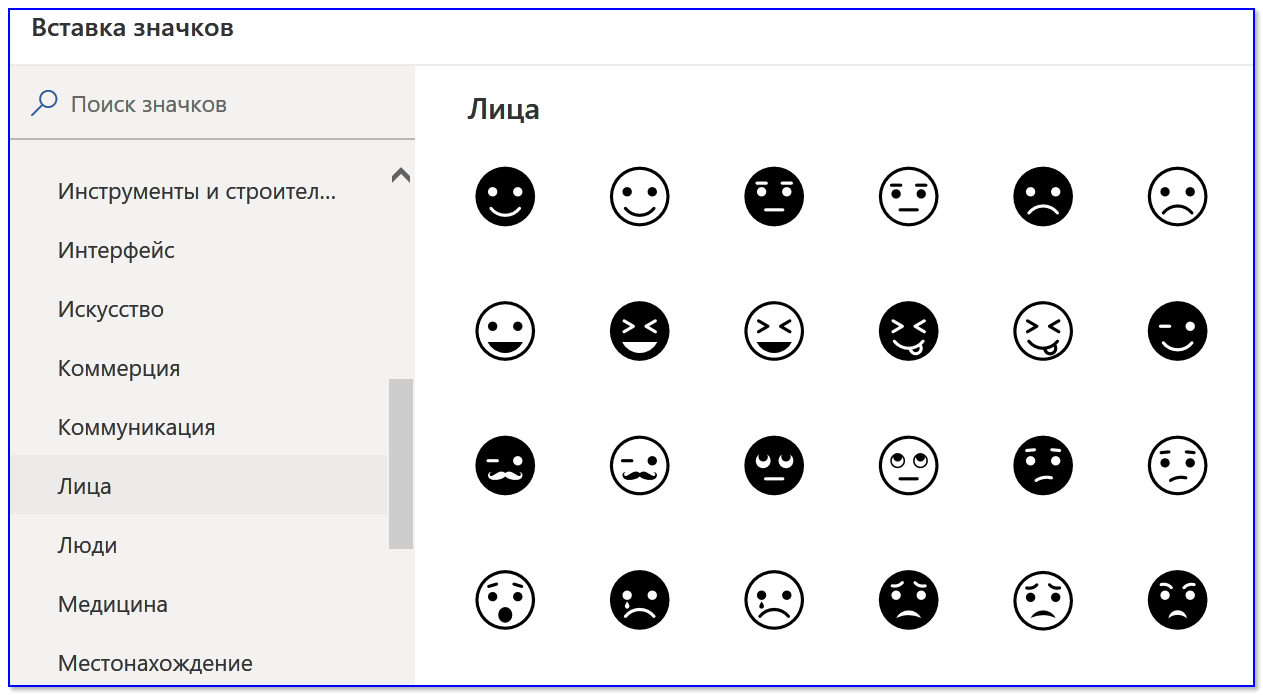 Если открыть раздел «Вставка/Значки» — перед вами предстанут тысячи самых разных значков по различным тематикам.