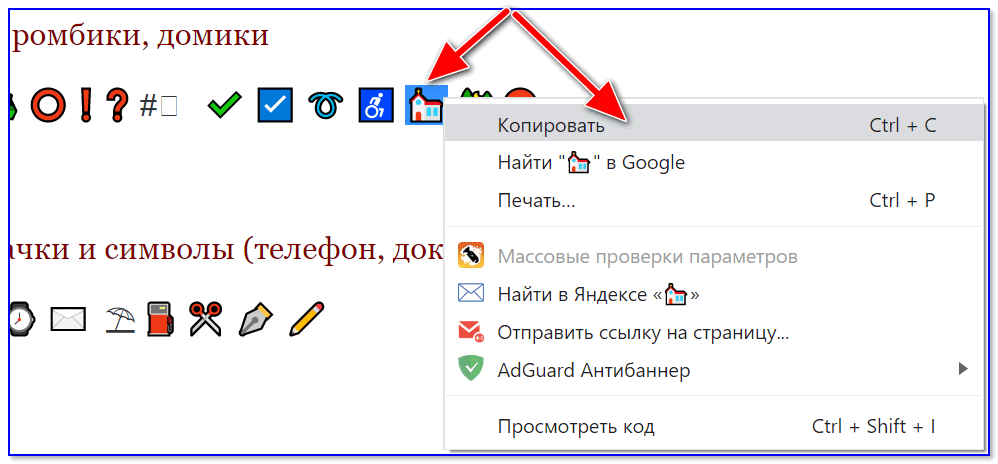Достаточно найти нужный вам значок на каком-нибудь сайте (каталоге), скопировать его (Ctrl+C) и вставить в ваш текст (Ctrl+V). У меня на блоге есть небольшая подборка наиболее используемых значков и символов (ссылка ниже).