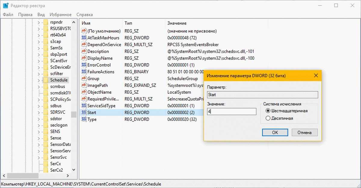 3. Откройте раздел Schedule и найдите в нем параметр с именем Start DWORD ( 32 бита ). Дважды кликните на нем и измените значение ключа на 2.