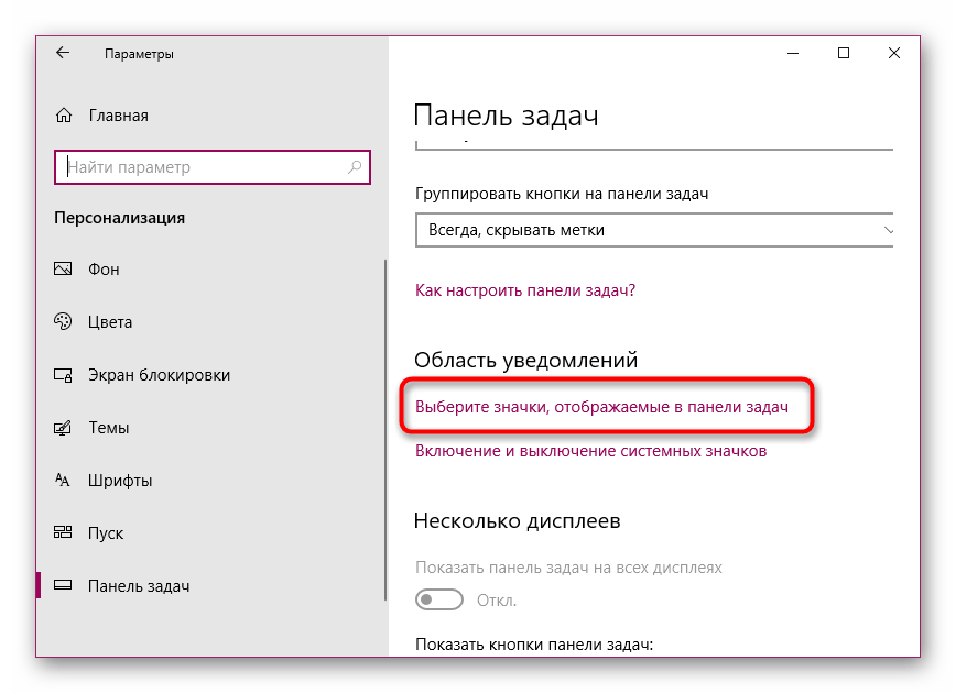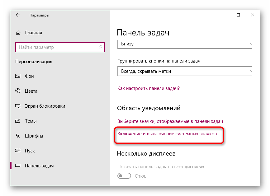 - В разделе с настройками внешнего вида дисплея перейдите сразу на последнюю вкладку «Панель задач». Проскролльте её до пункта области уведомлений. Здесь будет всего две ссылки. Сначала нажмите на первую.