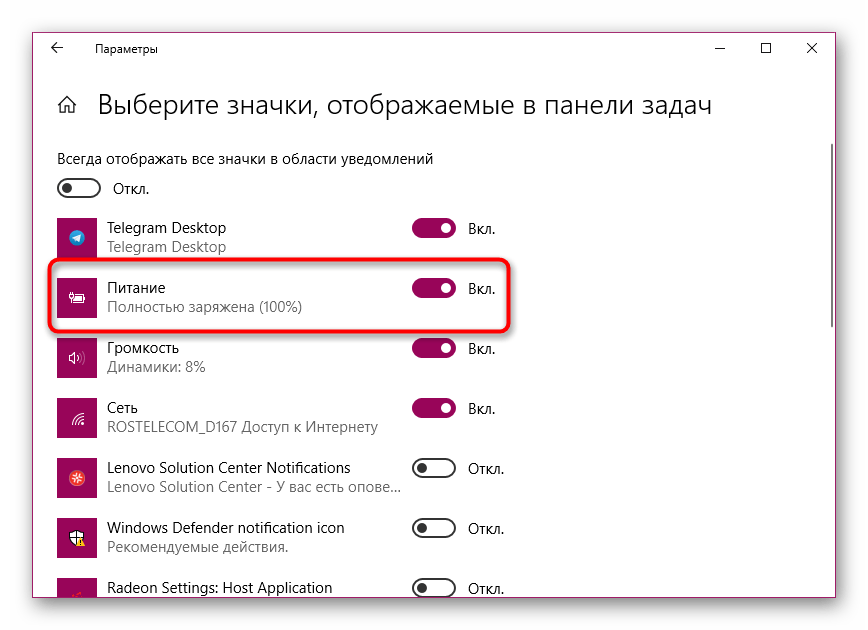 Как включить значок батареи Windows 10, если он отсутствует