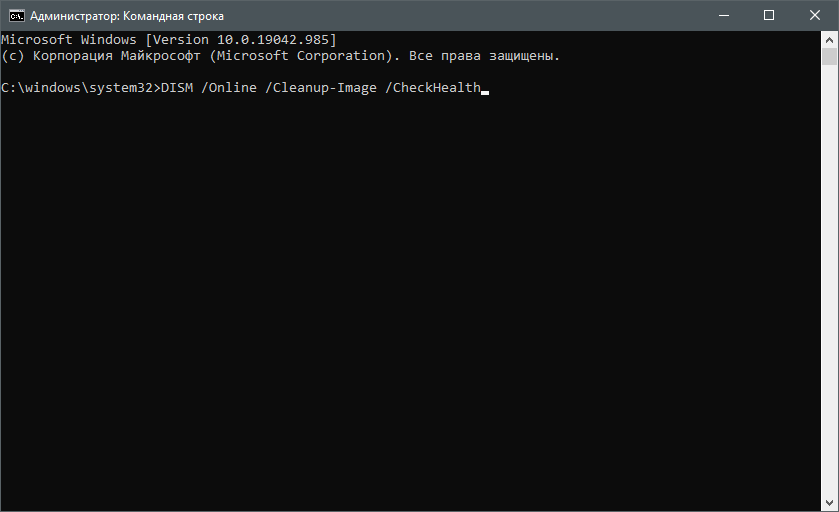 Введите команду DISM /Online /Cleanup-Image /CheckHealth и нажмите Enter для ее применения.